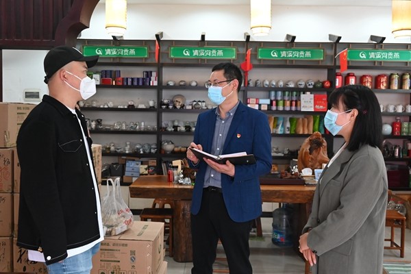 夷陵区通过流动接访、蹲点下访的方式,把接访桌搬到企业一线,持续纠治惠民利民、安民富民政策落实过程中遇到的敷衍塞责、推诿扯皮等问题。图为纪检监察干部在三峡茶城向群众了解有关情况。