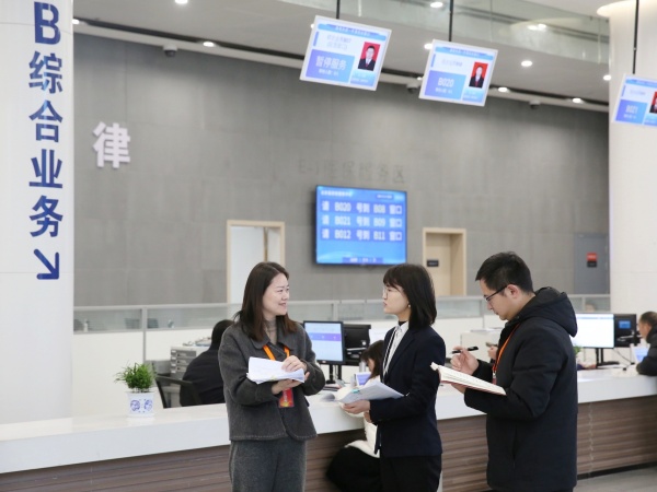 远安县纪委监委聚焦行政审批服务一窗通办、精简流程、压缩材料、帮办代办等过程开展靶向监督,推动企业办证办事便利措施落实落地。图为远安县纪检监察干部在县政务服务大厅了解办事效率、窗口人员工作作风等情况。