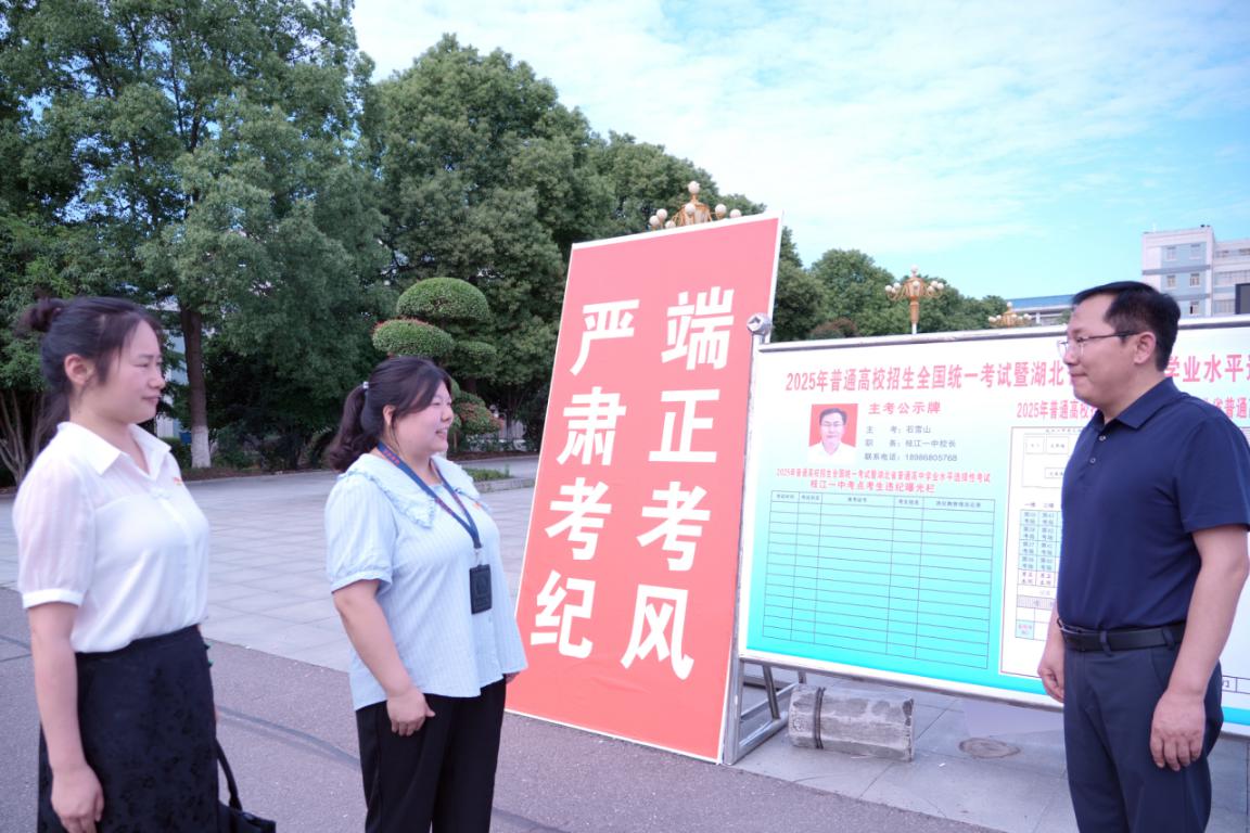 枝江市纪委监委通过实地走访、随机访谈、核验应急措施等方式,强化对教育部门履职尽责情况的监督检查,对发现的薄弱环节现场督促整改,以精准监督护航高考公平公正、安全平稳。图为该市纪检监察干部在考点现场督导。(宜昌市纪委监委)