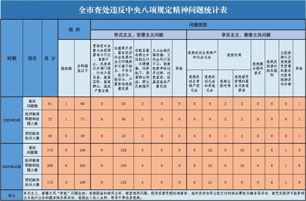 市纪委监委通报2025年第一季度全市查处违反中央八项规定精神问题情况