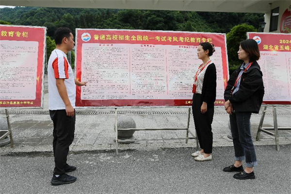 五峰土家族自治县纪委监委成立考风考纪专项督导组,通过开展警示教育、宣讲法律法规、签订《考试工作责任书》等方式,对高考考务工作者开展考风考纪专项培训,敲响考务纪律的警钟,确保考务工作公平、公正、公开。图为该县纪检监察干部在民族高中考点了解考务工作安排部署情况。