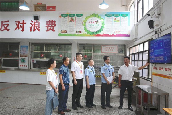 远安县纪委监委立足“监督的再监督”职责定位,督促市场监管等部门履职尽责,通过实地查看、现场快检等方式,对学校食堂食品采购储存、餐具清洁消毒、食品卫生管理等方面开展监督检查,让考生吃得安心。图为该县纪检监察干部在辖区内考点检查食品安全保障措施落实情况。
