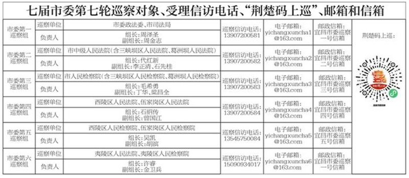 据悉,本轮巡察工作时间两个月左右。期间,设立专门值班电话、邮政信箱、电子邮箱、巡察意见箱和“荆楚码上巡”信访反映二维码,主要受理反映被巡察党组织领导班子及其成员、下一级党组织主要负责人和重要岗位领导干部问题的来信、来电,重点是关于违反政治纪律、组织纪律、廉洁纪律、群众纪律、工作纪律和生活纪律等方面的举报和反映。巡察组受理信访时间截至8月2日。