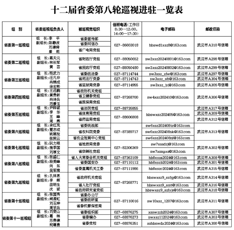 据悉,本轮巡视工作时间2个月左右,其间设立专门值班电话、邮政信箱、电子邮箱和“荆楚码上巡”信访反映二维码,主要受理反映被巡视党组织领导班子及其成员、下一级主要负责人和重要岗位领导干部问题的来信、来电,重点是关于违反政治纪律、组织纪律、廉洁纪律、群众纪律、工作纪律和生活纪律等方面的问题反映。巡视组受理信访时间截止到2024年12月29日。(记者杨宏斌、通讯员王婧、实习生陈子涵)