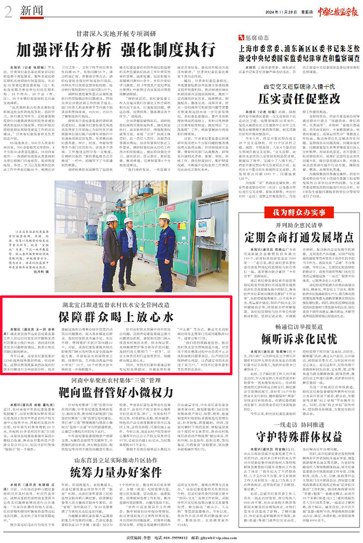 针对农村供水保障中存在的突出问题,宜昌市纪委监委建立重点问题领办机制,督促相关部门深入排查农村地区水质、供水保证率、水网梳理管护等方面存在的问题,及时约谈主管部门“一把手”,压实主体责任和行业监管责任,保障群众喝上放心水。