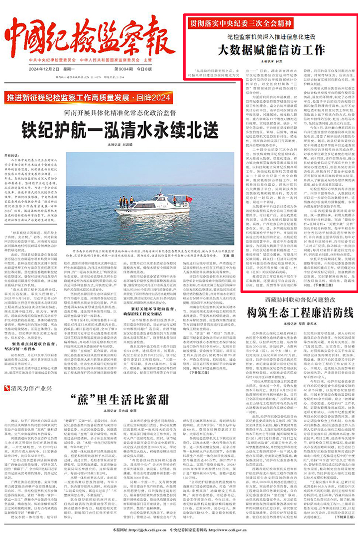 二十届中央纪委三次全会指出,加快构建数字纪检监察体系,深入推进大数据、信息化建设,着力解决数据重复填报等难点堵点问题,以科技赋能正风肃纪反腐各项工作。各级纪检监察机关贯彻落实二十届中央纪委三次全会精神,做实做细信访举报工作,积极推进信息化建设,深化应用信访大数据子平台,运用新技术加强数据收集和梳理分析,努力实现办好一起信访、解决一类问题、规范一个领域。