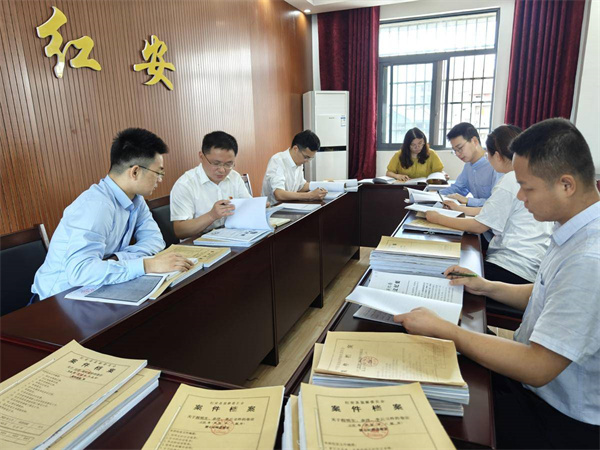 红安县纪委监委将案件质量评查作为提高案件质量的重要抓手。图为该县纪委监委整合相关纪检监察室、乡镇纪检监察机构人员力量,协作开展案件质量评查工作。(红安县纪委监委供图)