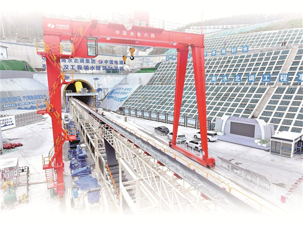 在湖北省襄阳市保康县店垭镇的引江补汉工程7号平洞洞口,引江补汉工程“江汉新石器号”TBM正式始发,碎石通过传送带送出隧道。 图片来源:视觉中国