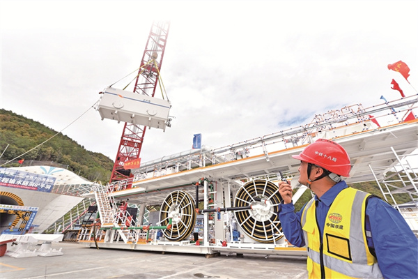 在湖北省保康县马良镇的引江补汉工程输水隧洞8号平洞施工现场,工人正指挥吊车组装硬岩掘进机。 图片来源:视觉中国