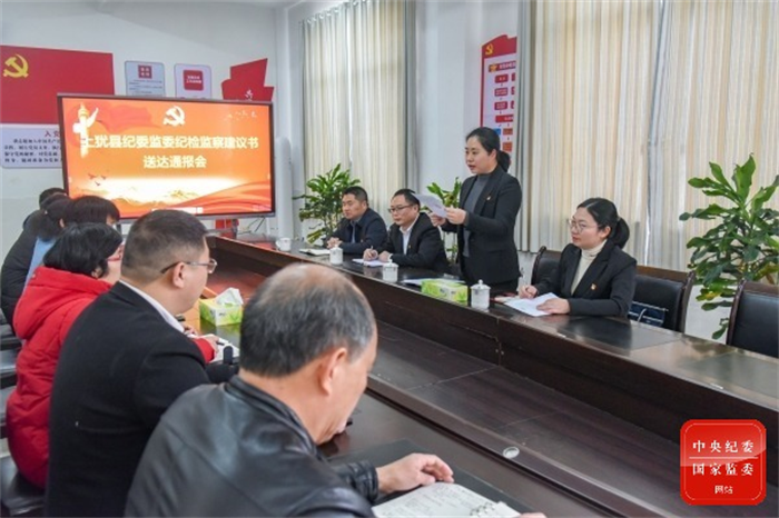 江西省上犹县纪委监委将警示教育融入处分决定宣布、建议公开送达,做实审查调查“后半篇文章”。图为该县纪委监委在某案发单位召开纪检监察建议书送达通报会,通报案情及宣读纪检监察建议书,对该单位班子成员开展警示教育,面对面传导以案促改责任压力。(江西省上犹县纪委监委 杨文国 摄)