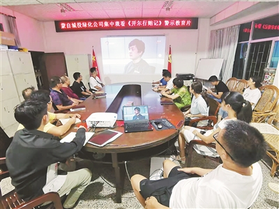 云南省纪委监委对昆明开尔科技有限公司为谋取非法利益、以巨额款项行贿“围猎”领导干部的典型案例进行深入剖析,拍摄警示教育片《开尔行贿记》。图为蒙自市城投绿化公司组织员工集中观看《开尔行贿记》。王敏佳 摄