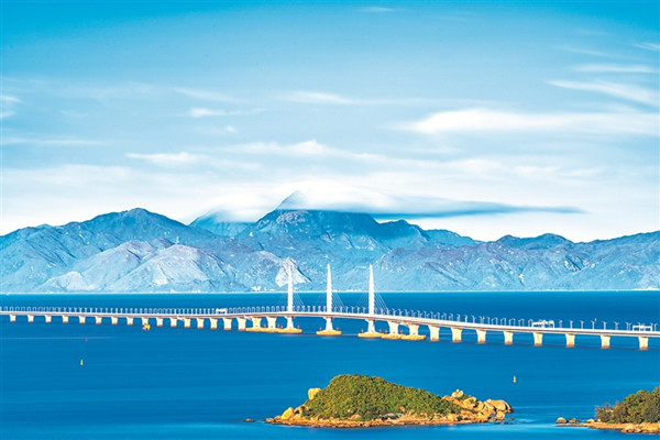 作为世界最长的跨海大桥,港珠澳大桥创造了世界桥梁史上的奇迹,粤港澳三地人流、车流和物流更加紧密地联系在一起,大湾区内的要素流动更为便利。自通车以来,港珠澳大桥珠海口岸货物进出口总值超3000亿元。 (图片来源:视觉中国)