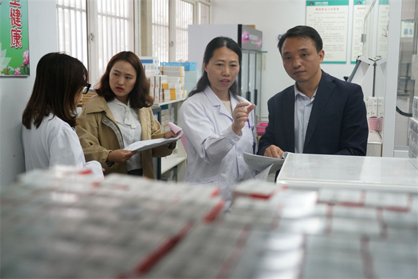 2019年10月31日,在江苏省海安市人民医院,巡察组工作人员在药房进行巡察,医疗卫生系统是此轮巡察重点。新华社记者 季春鹏 摄