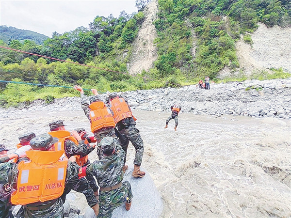 四川甘孜泸定县6.8级地震发生后,各方快速响应,不畏艰险,全力救灾。图为9月6日,武警四川总队甘孜支队救援官兵在泸定县磨西镇通过绳索前往河对岸,救助被困群众。新华社发(张文轩 摄)