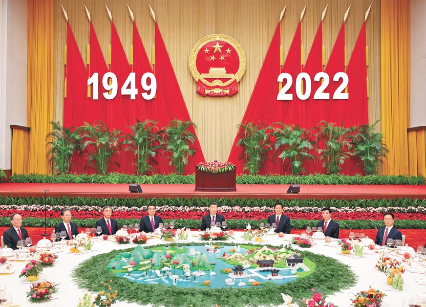 人民大会堂宴会厅华灯璀璨、鲜花绽放,洋溢着喜庆热烈的节日气氛。主席台上方,庄严的国徽高悬,“1949-2022”的大字年号在鲜艳的红旗映衬下格外醒目。