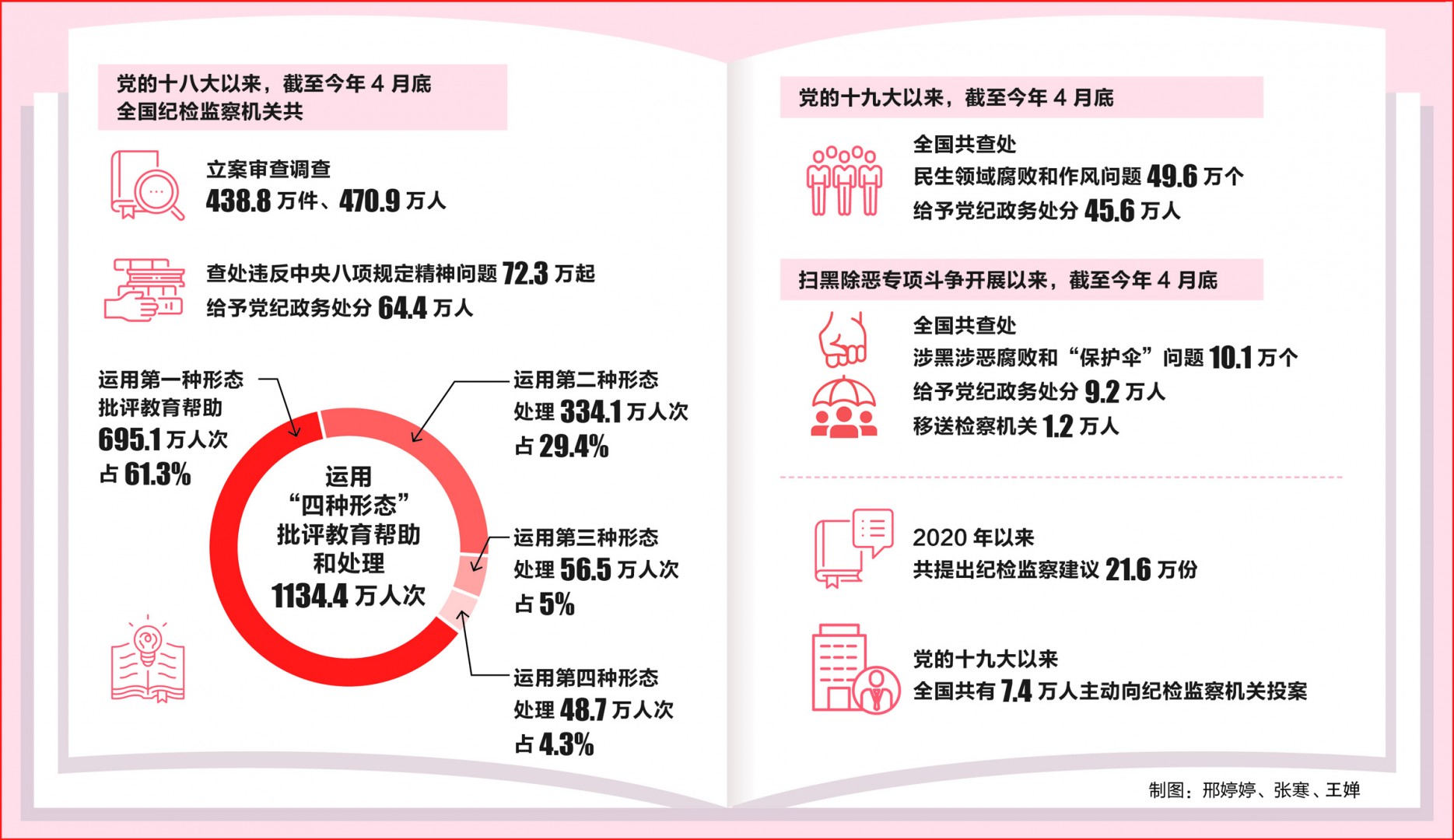 利剑高悬,雷霆万钧。党的十八大以来,截至今年4月底,全国纪检监察机关共立案审查调查438.8万件、470.9万人;查处违反中央八项规定精神问题72.3万起,给予党纪政务处分64.4万人;运用“四种形态”批评教育帮助和处理1134.4万人次……坚定不移“打虎”“拍蝇”“猎狐”,始终保持惩治腐败压倒性力量常在,“不敢腐”的震慑充分彰显。
