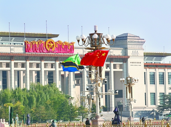 2022年11月3日,北京,天安门广场悬挂中国和坦桑尼亚两国国旗,欢迎坦桑尼亚总统哈桑对我国进行国事访问。哈桑总统是党的二十大闭幕后首位访华的非洲国家元首。(图片来源:视觉中国)