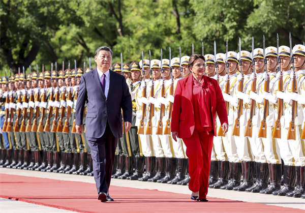 6月12日下午,国家主席习近平在北京人民大会堂同来华进行国事访问的洪都拉斯总统卡斯特罗举行会谈。这是会谈前,习近平在人民大会堂东门外广场为卡斯特罗举行欢迎仪式。 新华社记者 刘彬 摄