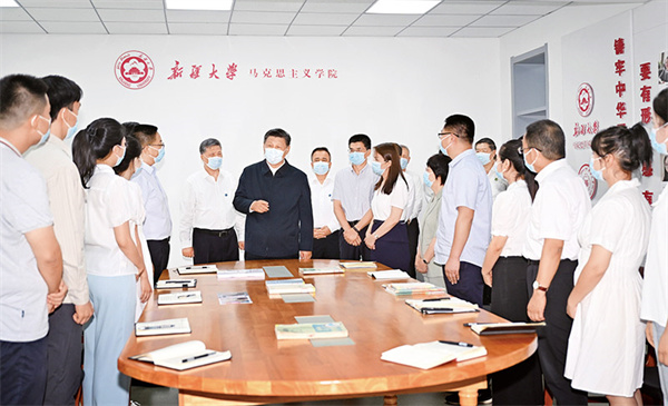 2022年7月12日至15日,中共中央总书记、国家主席、中央军委主席习近平在新疆考察。这是12日下午,习近平在新疆大学铸牢中华民族共同体意识研究基地,同师生亲切交流。 新华社记者 李学仁/摄