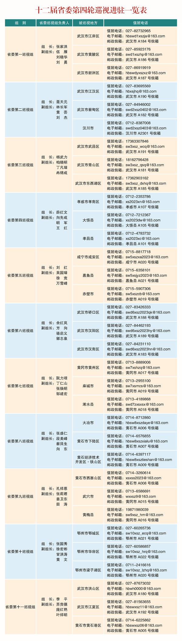 根据省委统一部署,本轮巡视将对武汉市江岸区、江汉区、硚口区、汉阳区、武昌区、青山区、洪山区、蔡甸区、江夏区、东西湖区、汉南区、黄陂区、新洲区;大冶市、黄石市黄石港区、西塞山区、下陆区、黄石经济技术开发区·铁山区;鄂州市鄂城区、华容区、梁子湖区;孝感市孝南区、汉川市、大悟县、孝昌县;黄冈市黄州区、麻城市、浠水县、武穴市、黄梅县;咸宁市咸安区、嘉鱼县、赤壁市共33个县(市、区)开展常规巡视,同步开展选人用人工作、落实意识形态工作责任制和巡察工作专项检查。