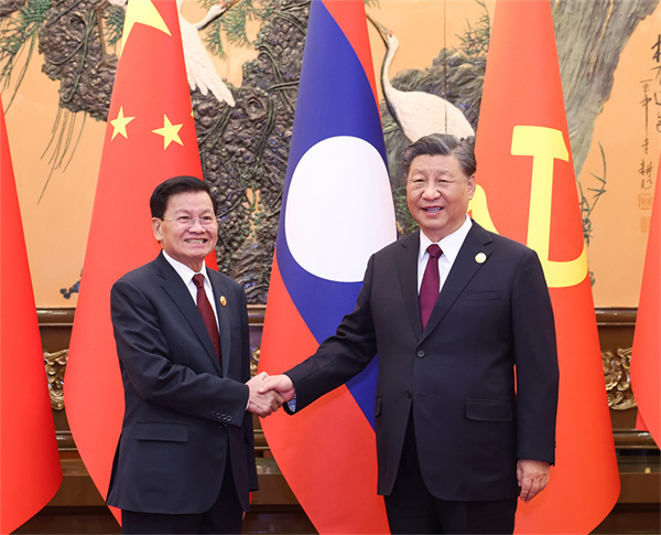 10月20日上午,中共中央总书记、国家主席习近平在北京人民大会堂会见来华出席第三届“一带一路”国际合作高峰论坛并进行工作访问的老挝人民革命党中央总书记、国家主席通伦。新华社记者 刘卫兵 摄