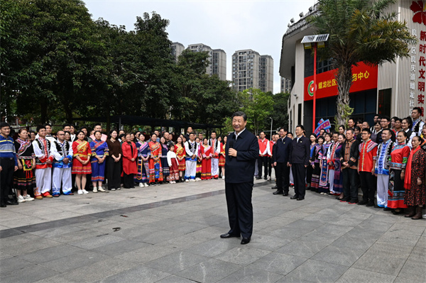 离开社区时,各族群众热情欢送总书记。习近平亲切地对大家说,我昨天结束对越南的国事访问,直接来广西考察调研。构建具有战略意义的中越命运共同体,将更有利于广西的开放发展,壮美广西前景光明。广西作为我国少数民族人口最多的自治区,各族人民同顶一片天、同耕一垌田、同饮一江水、同建一家园。全面建设社会主义现代化国家,一个民族都不能少。希望社区各族群众多来往,大家互帮互助,交知心朋友,做和睦邻居,共同建设幸福家园。