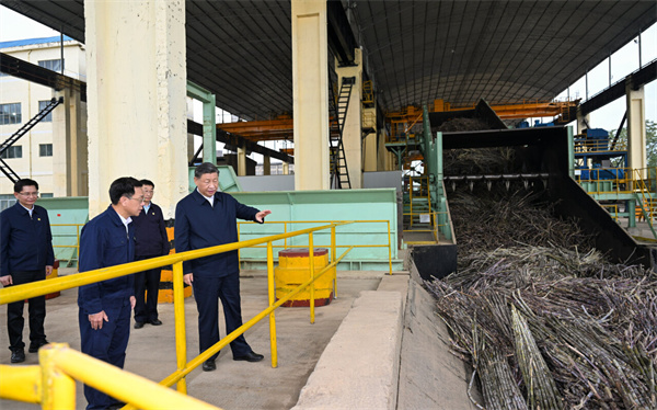 14日下午,习近平到来宾市考察调研。在国家现代农业产业园黄安优质“双高”糖料蔗基地,习近平察看万亩甘蔗林和机械化作业收割场景,听取基地情况介绍。他走进甘蔗林,详细了解甘蔗良种繁育技术要领,同蔗农、农机手和农技人员亲切交流。习近平指出,广西是我国蔗糖主产区,要把这一特色优势产业做强做大,为保障国家糖业安全、促进蔗农增收致富发挥更大作用。要积极培育和推广良种、提高机械化作业水平,建设好现代农业产业园。要探索建立更加稳定的利益联结机制,让广大农民共享农村改革和发展成果。他祝愿乡亲们的生活像甘蔗一样甜蜜。