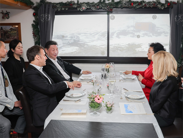 驿站木屋外,春雪纷飞,云海浩渺。两国元首夫妇凭窗而坐,远眺群山,品当地特色美味,论天下风云际会,在轻松愉快的氛围中就一些重要问题进行了战略沟通。