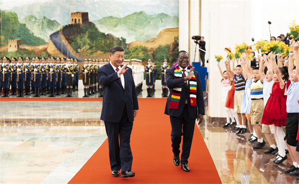 9月3日下午,国家主席习近平在北京人民大会堂同来华出席中非合作论坛北京峰会并进行国事访问的津巴布韦总统姆南加古瓦举行会谈。这是会谈前,习近平在人民大会堂北大厅为姆南加古瓦举行欢迎仪式。新华社记者 黄敬文 摄