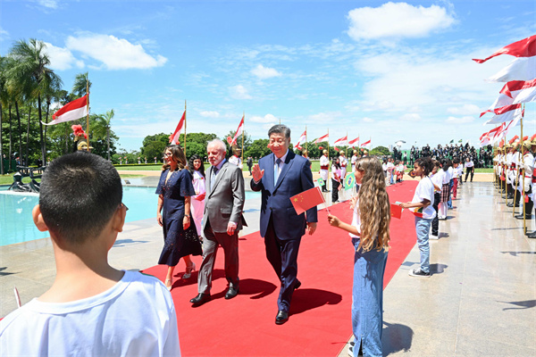 军乐团奏中巴两国国歌。两国元首一同观看仪仗队分列式。中巴儿童挥舞两国国旗热烈欢迎习近平。巴西艺术家用中文演唱《我的祖国》。