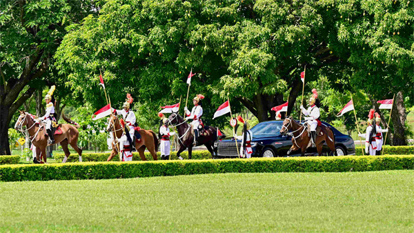 初夏时节的巴西利亚,天朗气清。黎明宫内,绿草如茵,450名威武礼兵整齐列队。在120名龙骑兵护卫下,习近平乘车抵达黎明宫前广场。