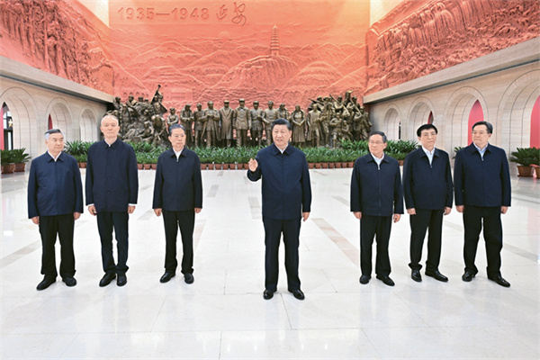 2022年10月27日,中共中央总书记、国家主席、中央军委主席习近平带领中共中央政治局常委李强、赵乐际、王沪宁、蔡奇、丁薛祥、李希,瞻仰延安革命纪念地。这是习近平在延安革命纪念馆参观《伟大历程——中共中央在延安十三年历史陈列》结束时发表重要讲话。 新华社记者 燕雁 摄