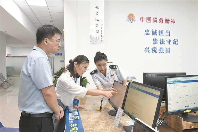 安徽省宣城市宣州区纪委监委聚焦落实税费政策、优化办税效率及服务质量开展监督,推动“减税降费”“一窗通办”等举措落地见效。图为日前,该区纪检监察干部在区政务服务中心税务综合窗口了解相关情况。何冬霞 摄