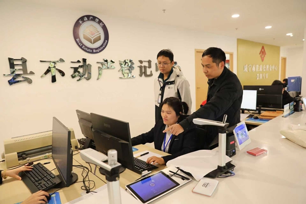 湖北省咸宁市纪委监委深入一线,了解不动产登记服务质量等情况,督促相关职能部门优化业务办理流程,切实增强群众的获得感与幸福感。图为该市崇阳县纪检监察干部在县不动产登记中心了解相关情况。袁木成 摄