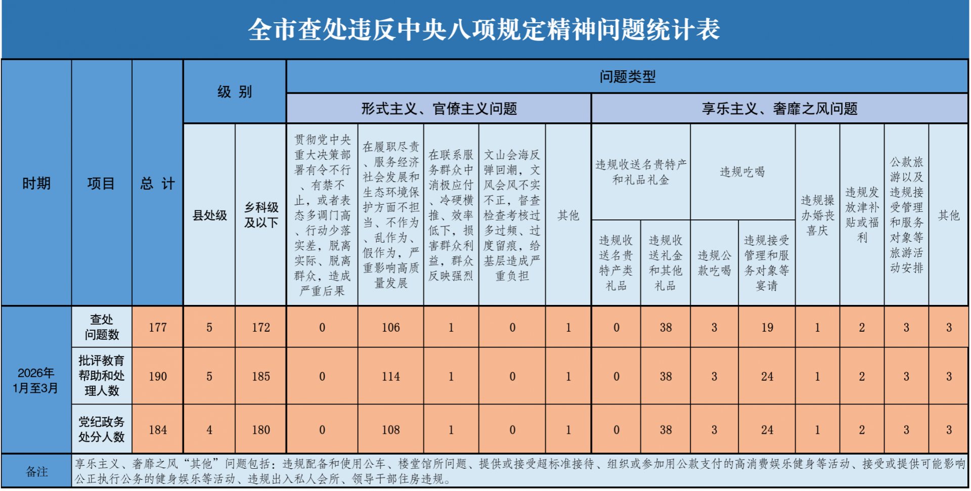 2026年第一季度,全市查处违反中央八项规定精神问题177起,批评教育和处理190人,其中,党纪政务处分184人。