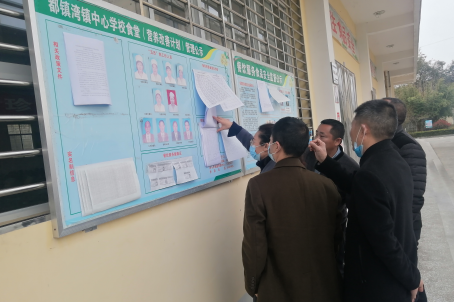图为县纪委监委干部现场查看都镇湾镇学校食堂管理公示