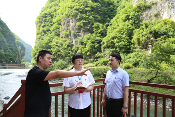 图为兴山县专项督查组工作人员在香溪河流域了解河道岸线治理情况。