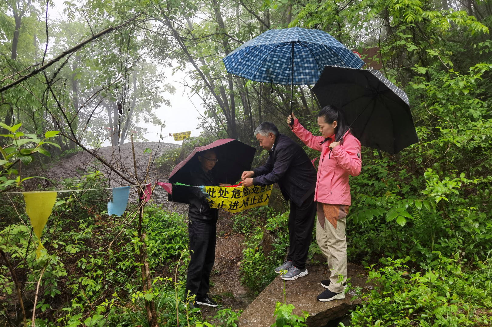 图为贺家坪镇纪委实地检查警示标识,加固防护网。