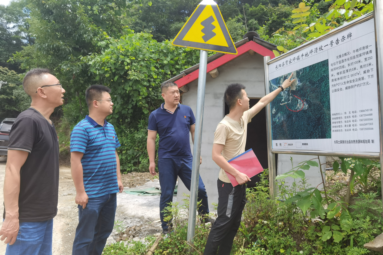 图为纪检监察干部实地查看地质灾害点警示牌。
