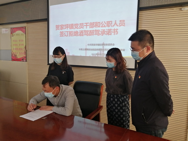 图为贺家坪镇纪委组织全体机关干部签订《党员干部和公职人员拒绝酒驾醉驾承诺书》
