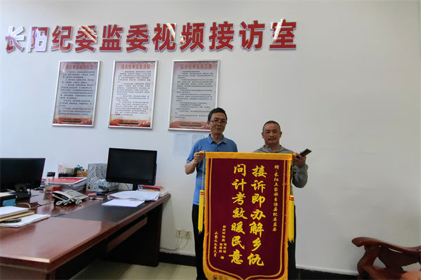 图为信访人向县纪委监委信访室送上锦旗表示感谢
