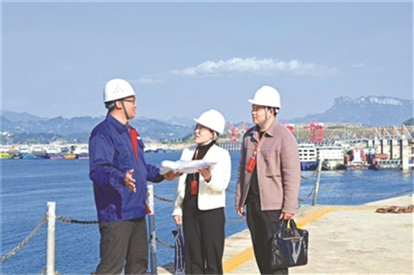 湖北省秭归县纪委监委将三峡库区生态修复纳入政治监督重点任务,紧盯船舶污染物防治、绿色转型发展等关键领域开展监督,严肃整治工作推进中的腐败和作风问题。图为近日,该县纪检监察干部在三峡绿色智能船舶制造基地了解相关情况。郑玉涵 摄