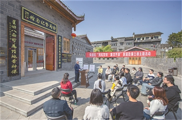 重庆市荣昌区纪委监委联合区妇联等单位开展“清风常伴·廉洁齐家”家庭助廉立德主题活动,教育引导党员干部注重家庭家教家风建设。图为近日,讲解员在喻茂坚纪念馆门前为党员干部及其家属讲述喻氏家族清廉家风故事。 张春连 摄