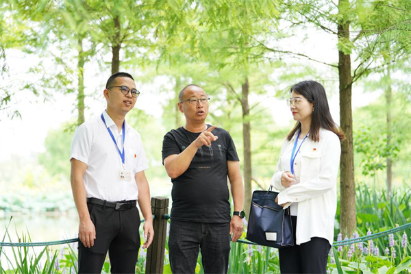 图为该市纪检监察干部在五湖水系贵子湖走访了解水环境修复工作成效。
