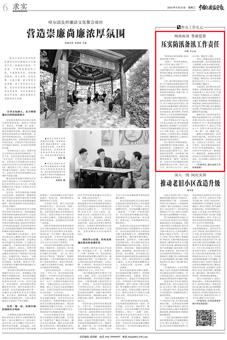 与此同时,我们聚焦防汛责任落实、风险隐患排查、宣传培训演练等5个重点方面,开展“拉网式”监督排查,以“室组地”联动监督、闭环式销号整改的方式提升监督质效,同时畅通信访举报渠道,对群众反映的防汛工作失职失责等问题,启动速查快办机制,严肃查处防汛工作中的腐败和作风问题。